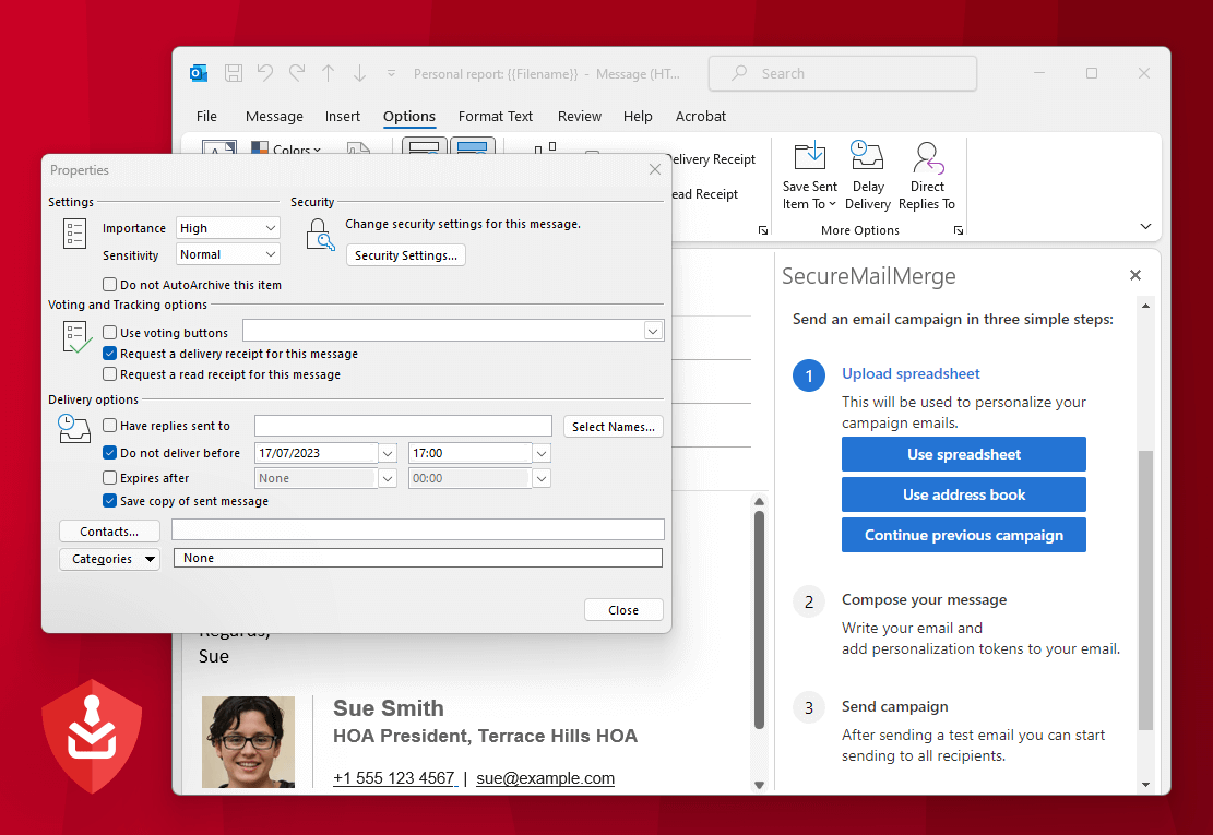 SecureMailMerge ofrece funciones avanzadas de combinación de correo y capacidades que optimizan todo el proceso, desde la programación y personalización hasta la analítica y el seguimiento para Outlook. Estas herramientas te permiten configurar y gestionar correos electrónicos recurrentes sin esfuerzo, ahorrando tiempo y asegurando precisión.